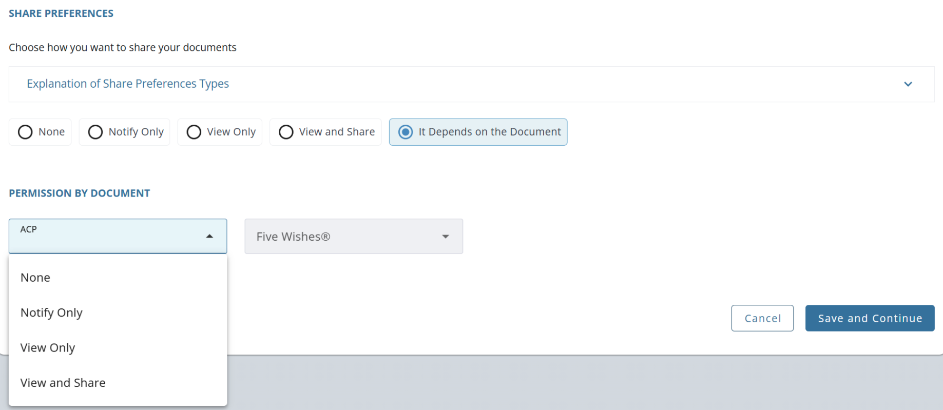 5. If you have provided an email address and/or phone number for your contact, under the lower section "Share Preferences" select the level of access you feel is appropriate for this contact. You can select to provide the same level of access for all documents on your MyDirectives® account, or a different level of access by document type (see bullets an and b below).