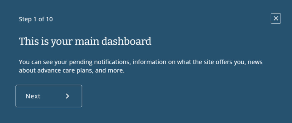 4. Once your account has been verified, you will be taken to your dashboard and will begin the tour of our site and how to navigate it. Follow along with the navigation tool by clicking on the Next button as it shows you around. If you do not wish to have a tour, you can click on the in the top right-hand corner of the box.