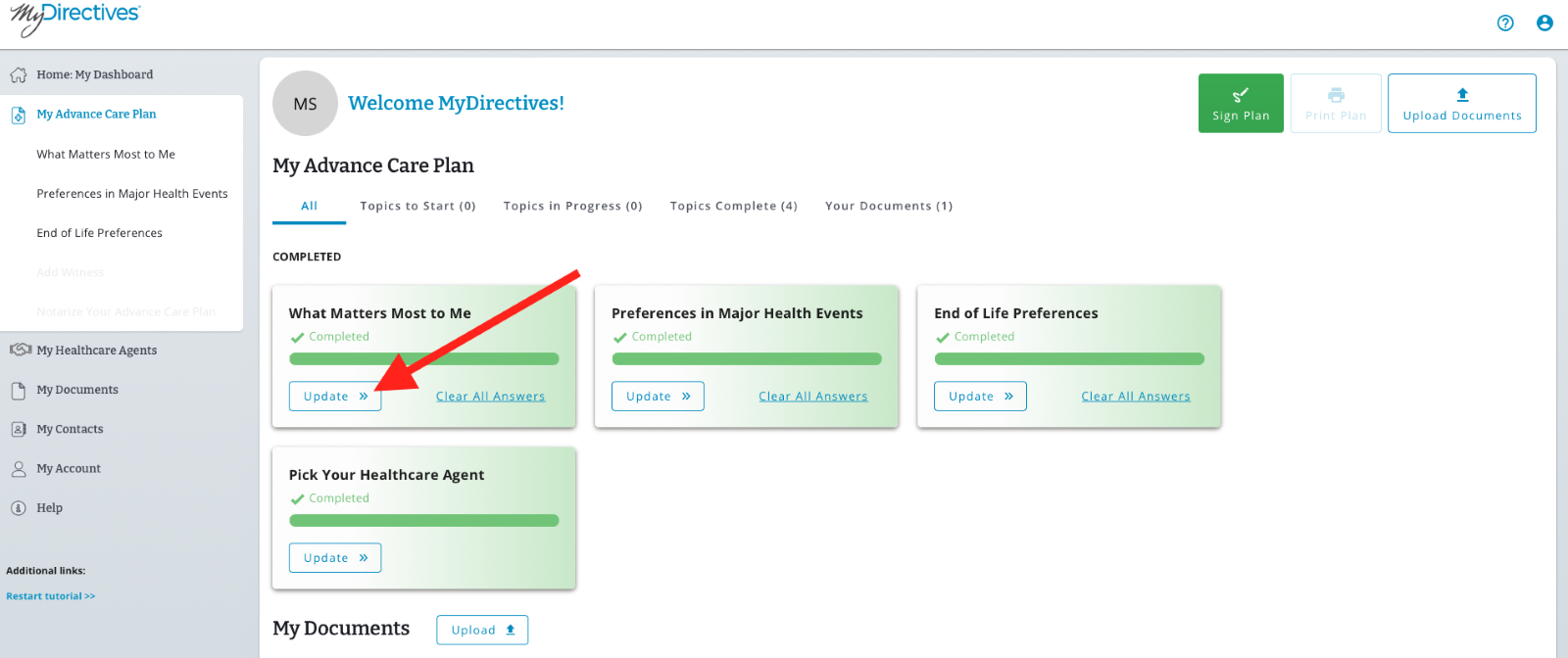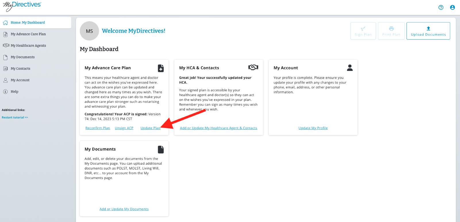 2. On the My Dashboard screen, click on the Update Plan link to be taken to your Advance Care Plan page.